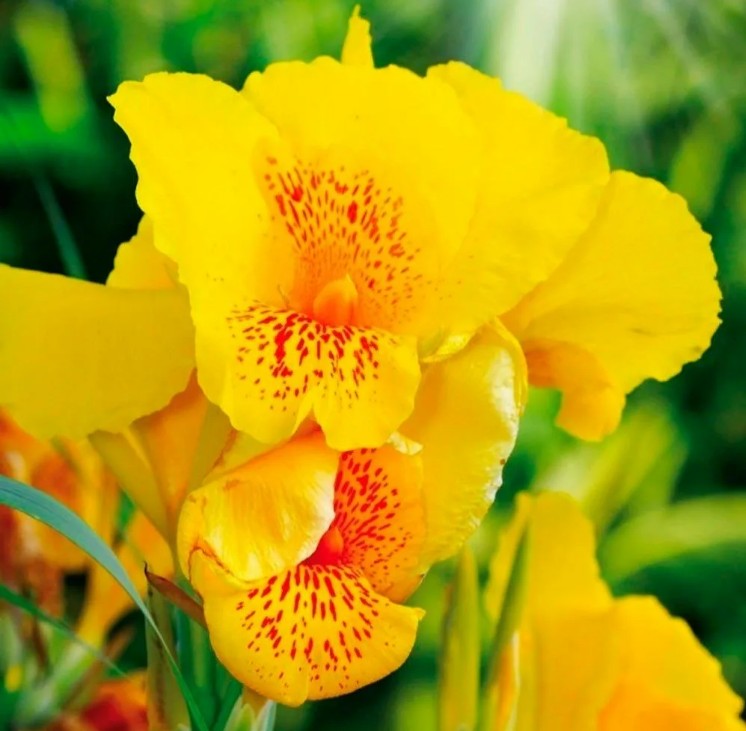 Канна Йеллоу Хамберт представляет собой многолетнее растение с корневищем, принадлежащее к семейству Канновые. Достигая высоты до 120 см, это растение выделяется крупными зелеными листьями овально-продолговатой формы с легким заострением. Ярко-желтые цветки с красными крапинками, диаметром до 10 см, придают растению особую декоративность. Цветение начинается с середины лета и продолжается до первых заморозков, обеспечивая декоративный вид на протяжении всего сезона.