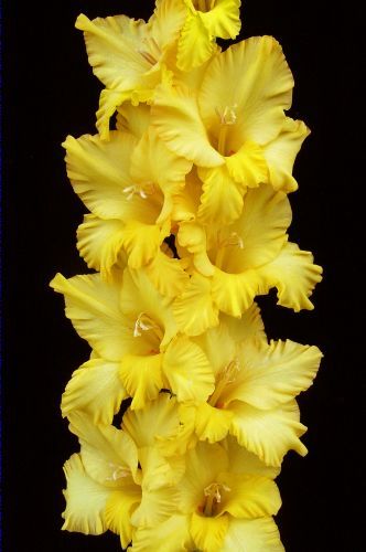 Гладиолус "Храм Солнца" выделяется своей уникальной темно-желтой окраской. Этот сорт, созданный селекционером Барановым, славится своими яркими и насыщенными лепестками. Зарегистрированный в 2009 году, "Храм Солнца" быстро завоевал популярность среди цветоводов. Высота цветоноса достигает 160 см, а прочный стебель поддерживает колосовидное соцветие длиной около 75 см. Одновременно может раскрыться до 9 бутонов из 23. Цветки этого сорта имеют диаметр около 16-17 см и отличаются равномерным, светящимся желтым оттенком. Тычинки также окрашены в желтый цвет, а лепестки имеют глубокую складчатую гофрировку.